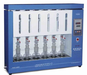 产品简介:仪器特点:本公司引起脂测定新技术,性能稳定、准确度高、操作省力、省时,测定结果符合国家(GB5512-85)标准,各项指标达到国内领先水平。  本仪器根据索氏抽提原理、用重量测定方法来测定脂肪含量。即在有机溶剂下溶解脂肪,用抽提法使脂肪从溶剂中分离出来,然后烘干,称量、计算出脂肪含量。  本仪器主要有加热浸泡抽提,溶剂回收和冷却三大部分组成。操作时可以根据试剂沸点和环境温度不同而调节加热温度,试杆在抽提过程反复浸泡及抽提、从而达到快速测定目的。